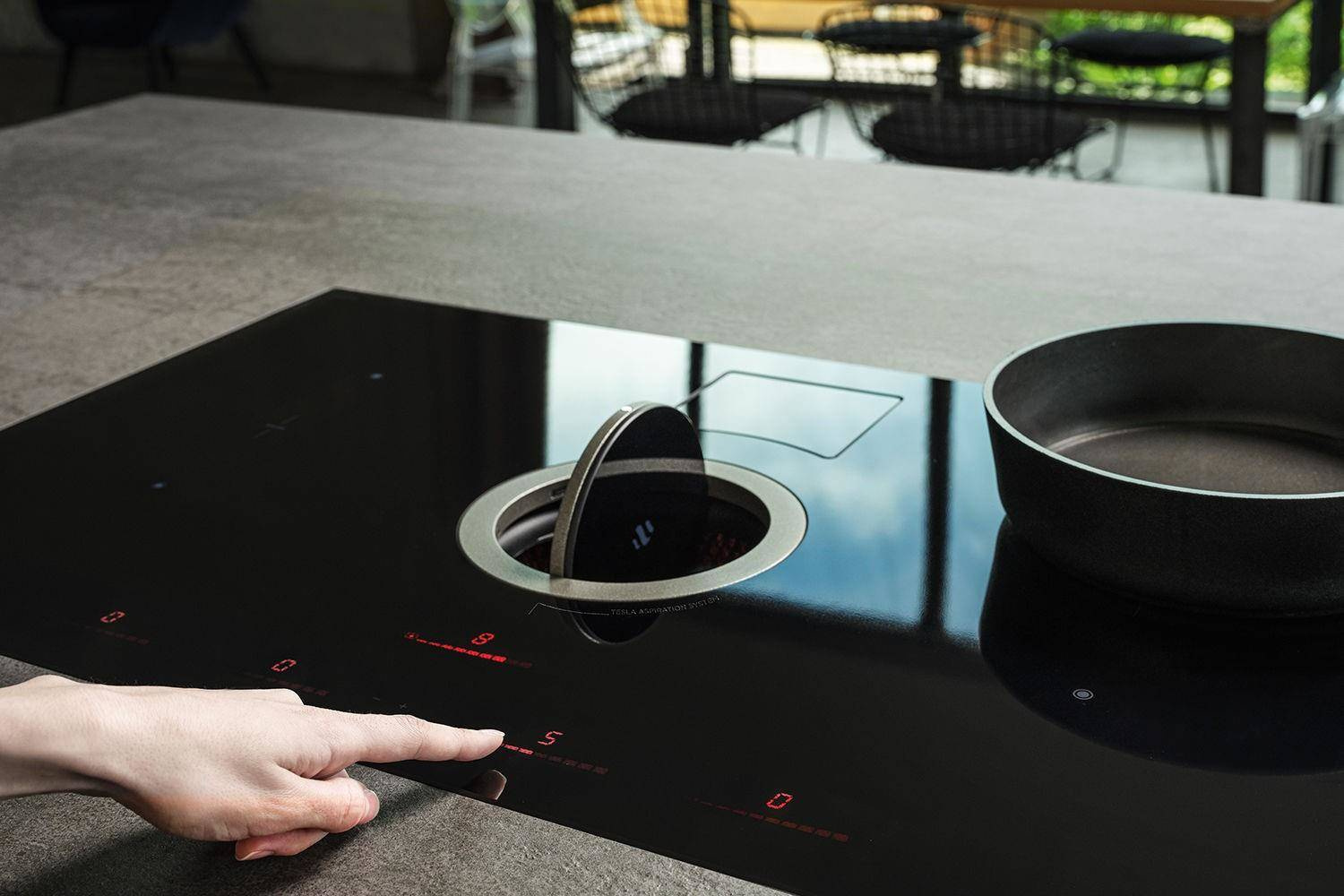 Powrót do źrodeł dzięki prostej płycie indukcyjnej z ciągłą powierzchnią i wyświetlaczem niewidocznym w trybie czuwania. Płaszczyznę zasysania schowano sprytnie za charakterystycznym szklano-żeliwnym pierścieniem i nie koliduje ona z innymi elementami.